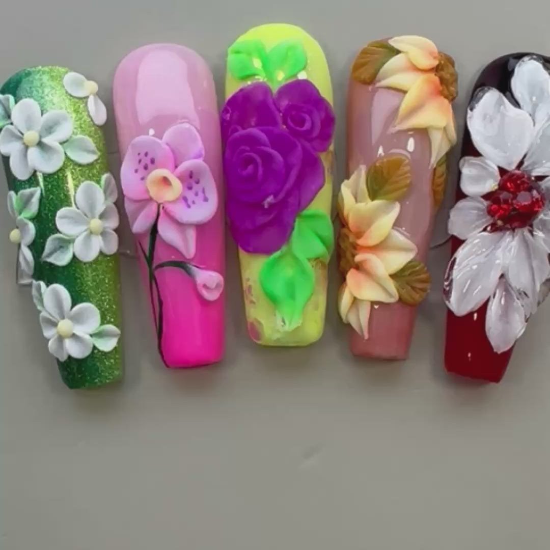 Learn to create stunning 3D flower designs with our expert class. Our proprietary brand of 3D acrylic powders will help you create beautiful, realistic flowers with ease. Perfect for beginners or those looking to perfect their skills. Join now and improve your nail art!